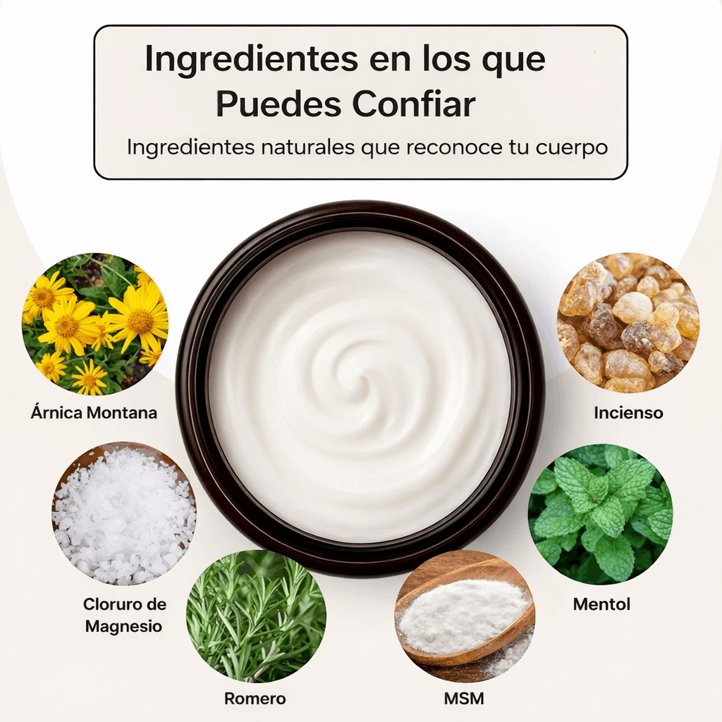 Elenco INCI : Acqua, Cloruro di magnesio, Metilsulfonilmetano (MSM), Estratto di foglie di Aloe Barbadensis, Glicerina, Estratto di Boswellia Serrata (Frankinscens), Estratto di fiori di Arnica Montana, Olio di foglie di Rosmarinus Officinalis (Rosmarino), Niacinamide, Olio di emù, Cetearyl Olevate, Sorbitan Olevate, Mentolo, Fenossietanolo, Sorbato di potassio, Tocoferil Acetato