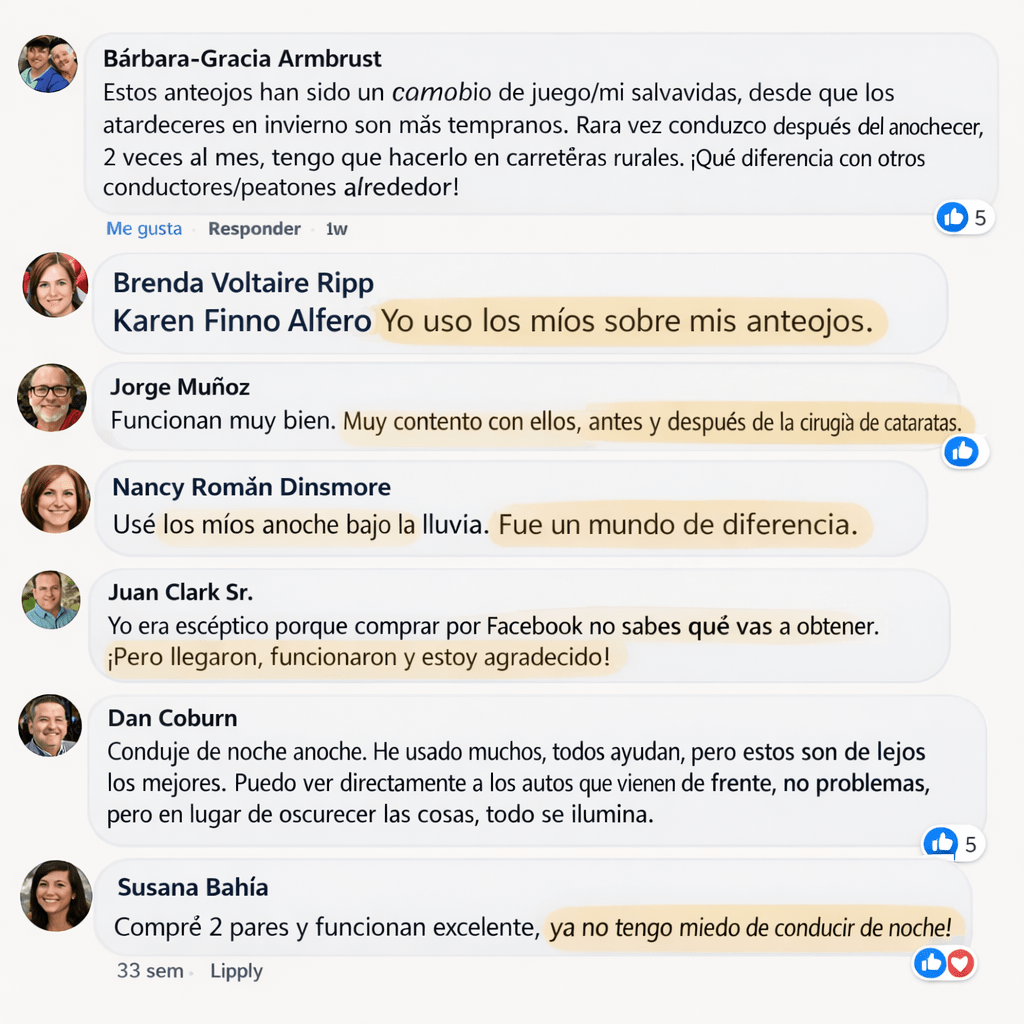 Las gafas para faros podrían ser la solución ideal para usted. Miles de clientes han compartido cómo su visión y confianza mejoraron drásticamente mientras conducían de noche con gafas de faros encendidas.