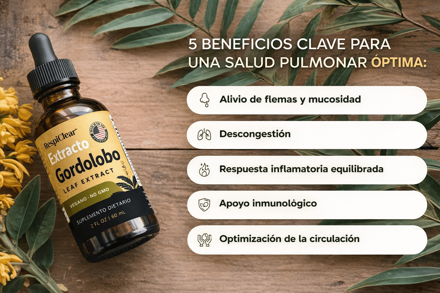 La mayoría de los suplementos pulmonares contienen salmonete en dosis bajas — la única hierba que realmente te extingue. RespiClear proporciona un extracto líquido de alta potencia de gordolobo silvestre — no polvos débiles, no rellenos.
